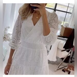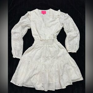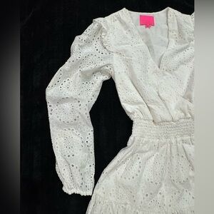 2022 new with no tags LILLY PULITZER Taviana Eyelet Dress Resort White Circle Bloom Eyelet. Daintily detailed eyelet makes the Taviana Eyelet Dress our top pick for spring and summer social occasions. We love this long-sleeve style for its easy fit, graceful surplice neckline, smocked waist, and feminine ruffle accents at the shoulders and hem.