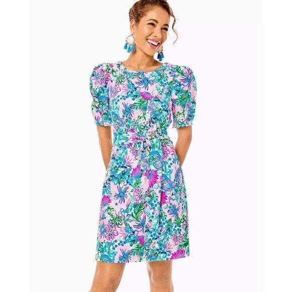 🌺 LILLY PULITZER Tropical Print Puff Sleeve Harriet Dress with Belt S NWT