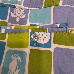 Excellent condition. Lilly Pulitzer Women’s short. Green purple & blue square print. Pattern has crabs & lobsters and Lilly logo. Bric a brac side trim, pockets. Size 14. See photos for measurements