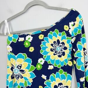 Gorgeous silk blend asymmetrical dress by Lilly Pulitzer. One shoulder/sleeve. Floral Frenzy print in navy blue, yellow, green, white, and turquoise. Great preowned condition. Women’s size 2.
