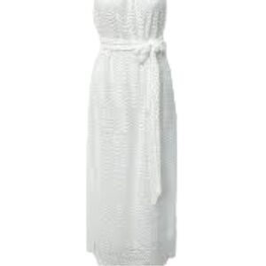 Elegant and effortlessly versatile, this Lilly Pulitzer white lace midi dress works beautifully for both bridal moments and elevated resort occasions. Featuring a luxe gold chain halter neckline, removable tie belt, scalloped lace detailing, and a flattering side slit—this fully lined dress is the perfect mix of refined and relaxed. Wear it to a beach wedding, your bridal shower, rehearsal dinner, or pack it for a chic vacation night out.
