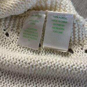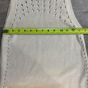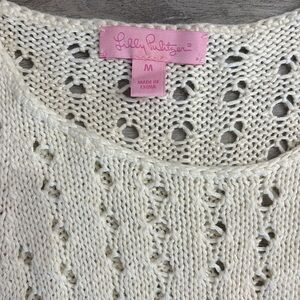 Lily Pulitzer Mac Sweater Tank in white, size M. It's a knit top with a ribbed hem and armholes, featuring eyelet detailing around the neckline and sides. The material is a soft, sweater-like knit, suitable for warmer weather or layering