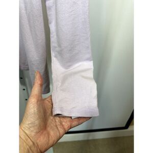 Pullover style. V-neckline. Long sleeves. Elasticized cross-back straps. Lavendar with white and purple crisscross striped straps. Stretch material. Yoga. Athleisure. Casual. Relaxed. Loungewear. Everyday. Resort wear. Preppy. G