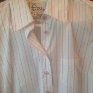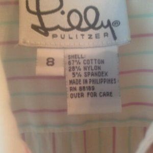 LILLY Pulitzer ... Very cute ** Sleeveless, button-down shirt/blouse with collar ** WHITE background with thin vertical strips in light PURPLE and TURQUOISE BLUE. Front chest pocket and shiny purple buttons * Embroidered PALM TREE logo at bottom right hem * straight hem * 67%cotton/28%nylon/5%spandex **