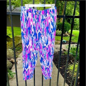 LILLY PULITZER zip front joggers/track pants in pink and blue pastel print