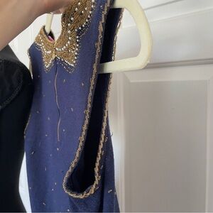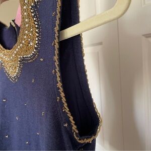 Good used condition Lilly Pulitzer “Kate” beaded sweater shell tank top. Size XS. Navy blue soft sweater material with gold beading design all over. There are a few places with missing and loose beads, as pictured. The sweater has some light wash wear. Lots of life left! Looks great for a night out or to the office.