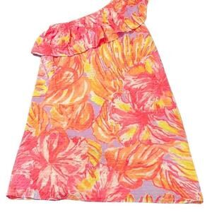 Lilly Pulitzer Emmeline One Shoulder Dress in Sun Splashed Women's size X-small. A ruffled, one-shoulder dress is a breeze for warm weather in lightweight seersucker fabric cut in a simple shift silhouette. Slips on overhead Smocked one-shoulder neck Lined Vibrant Pink, Orange, Yellow, Lilac