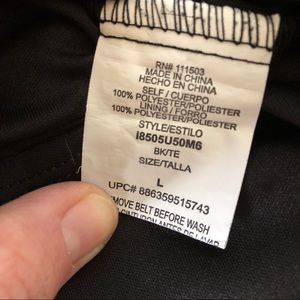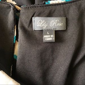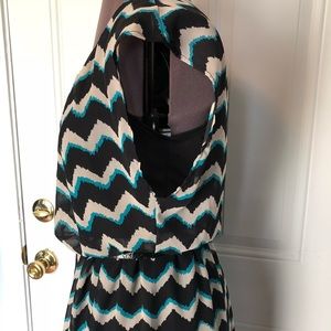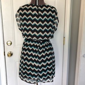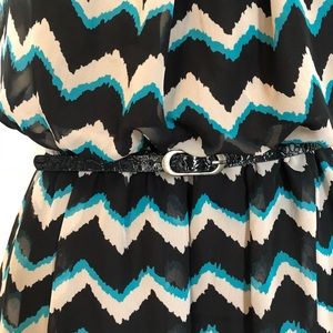 Fully lined, black, white, and teal chevron print dress. Elastic drop waist with belt. Small, unnoticeable stains on bottom of dress as shown in last picture. Measures approximately 34” from shoulder to hem with a 14” unstretched elastic waist. Good used condition.