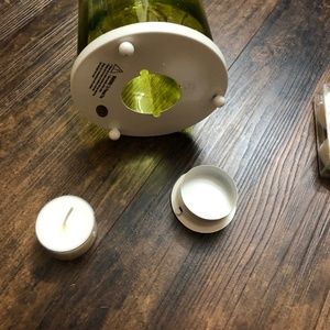 Bottom is metal with ball feet and a removable tray to easily insert your tea light. Metal hanging wire is secure around the neck of the bottle and allows you to hang the lantern from a tree or post .... or sit it on a table or walkway.