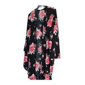 LIME N CHILI OPEN-FRONT CASCADING COVER-UP, WOMENS, M, BLACK W/PINK & GREEN ROSE