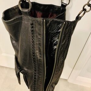 The limited edition Coach bag is vintage pebble leather, trimmed with patent leather, and accented with gunmetal black tone hardware. The patent leather wide whip stitch is the most unique feature of Devin collection. The bag can be expended by unzip side zippers and a unique front pocket has a framed coin purse with kiss closure. · The bag come with dust bag.Excellent Preloved condition- Complete with Burgundy/Purple Satin lining