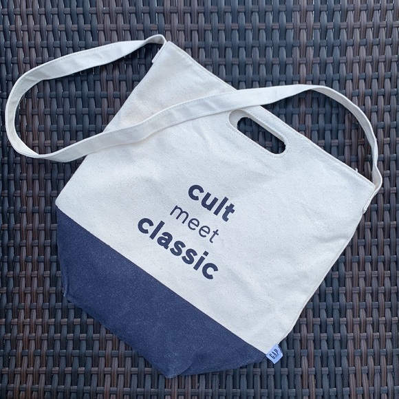 Gap Card Exclusive Canvas Tote Bag. Color block navy blue and oatmeal canvas printed with cult meet classic on one side, and meet me in the gap on the other. Cut in handles for carrying and attached shoulder strap. Bright yellow nylon lining.