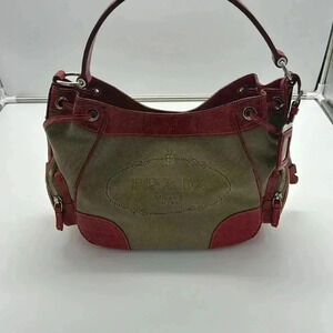 In great like new overall condition, only flaw is a small gummy part of the strap close to the sewn handle part has small cracking, but once covered with twilly its not noticeable or affecting the bags integrity, with Prada dustbag.