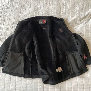 Black women's full zip fleece jacket. Embroidered pink logo on chest and back, breast cancer awareness ribbon on left sleeve. Style #: 0067. Soft fleece interior with waffle-texture outer. Two zippered pockets on front.