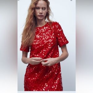 Round neck mini dress with short sleeves. Sequin appliqué. Back hidden in-seam zip closure.
