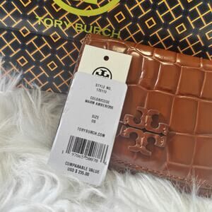 Brand new Tory Burch Bifold wallet in embossed crocodile leather (brown) with signature Britten logo.