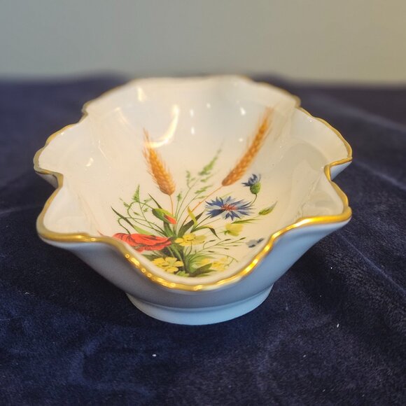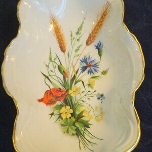 This vintage brightly hand painted dish is in the wheat and flower design with gold around the rim. It is in mint used condition; no crazing, chips or cracks. There is almost imperceptible wear on the bottom where it sits. The dish is vintage, likely mid century. Measurements: 4" wide, 7 " long, 1 and 3/4" high.