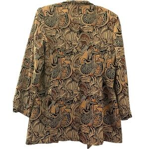 Very cool and elegant, this retro jacket blazer is knee length or just above. It is an open jacket. All cotton with a touch of spandex. Fully lined. The colors are beautiful black, golden brown, beige. It was challenging to capture the very true essence and colors of the garment. The closeup picture of the print is the most accurate. Shoulder pads, of course!