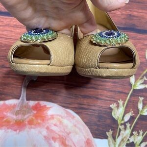 Versatile wedge peep toe heel with interchangeable medallion style snap. Some minor wear on upper edges and back of left heel as shown. Heel height is approximately 3”.