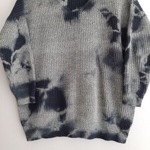 • Long sleeve v-neck knit pullover top in marled grey and navy blue tie dye pattern.