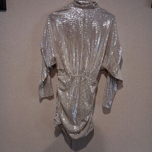 Shimmering silver sequin mini dress with long sleeves. Perfect for a night out.