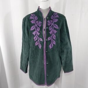 From Linea, by Louis Dell'Olio, this jacket, blazer is just exquisite! In lavender and teal green genuine suede leather, it features an appliqued botanical design in the lavender purple! Suede covered buttons, long sleeves, front pockets,! Fully lined in teal poly satin! Absolutely unique ,& stunning! Size L, Excellent! Superb EUC Condition! **ABSOLUTELY GUARANTEED CONDITION: EUC MINTY-EXCELLENT TO LIKE-NEW, by Lily @HauteClub!***