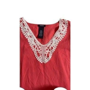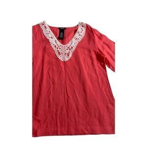 Gorgeous top by the brand "Premise." It is a size M/M and is made of 53% linen and 47% rayon. The top is a coral color and features a white crochet neckline. It has a v-neck and 3/4 sleeves. The top is in excellent condition and has no visible imperfections. It is new without tags or box.