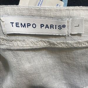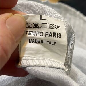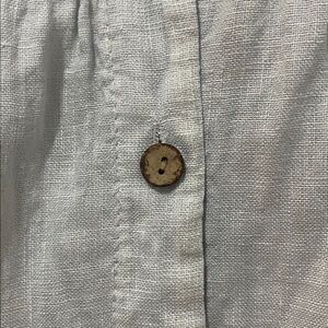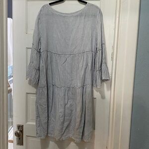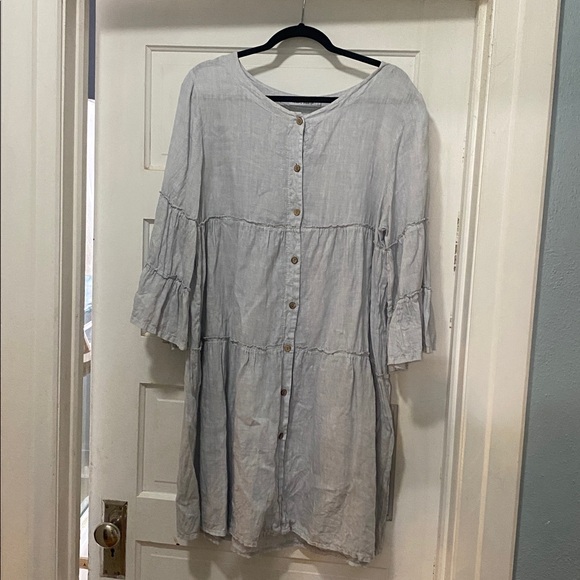 TEMPO PARIS LIGHT BLUISH/GREY 100 PERCENT LINEN BUTTON DOWN DRESS CUTE BELL SLEEVES. FLOWY SYTLE AND RUFFLE DETAIL. TAGGED SIZE L. PTP IS APPRX. 21 INCHES AND LENGTH IS APPROX. 38 INCHES. MADE IN ITALY.
