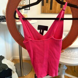 This bright pink crochet tank top is the cutest addition to your wardrobe. With adjustable straps and a thicker material, this top is extremely flattering and can be worn on its own or layered with your favorite blazer/cardigan. Perfect condition!!