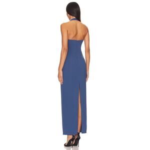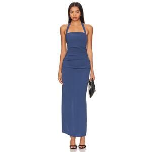 The LIONESS 1999 Maxi Dress in navy is a sleek, halter-neck gown crafted from a mid-weight crepe blend that skims the figure with chic ruched detailing and a back vent for effortless movement.