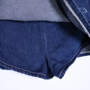 100% cotton, low-rise dark indigo denim with no stretch. Features include contrast stitching, belt loops, a zip fly, and built-in interior shorts.