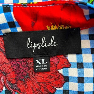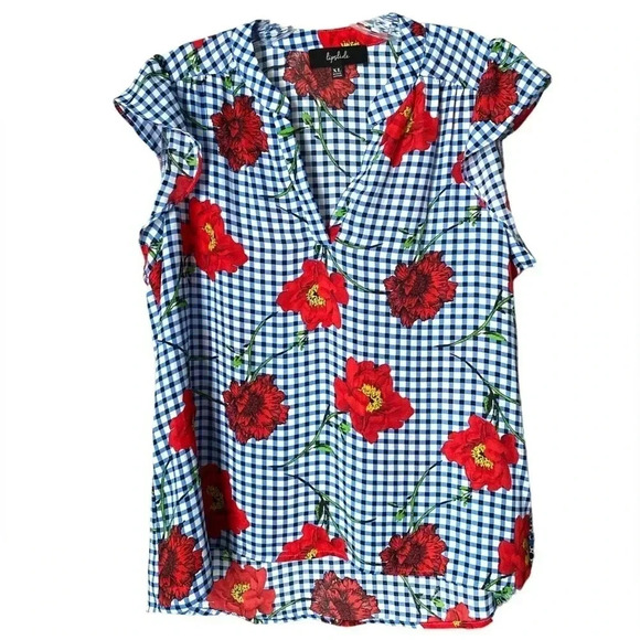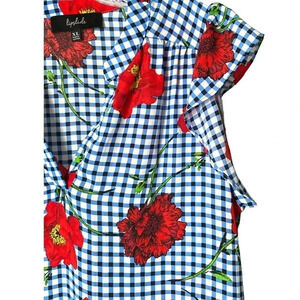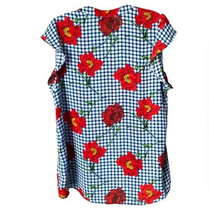 LIPSLIDE | Blue Gingham Floral Print Ruffle Cap Sleeves V-Neck Top Size XL