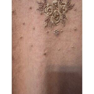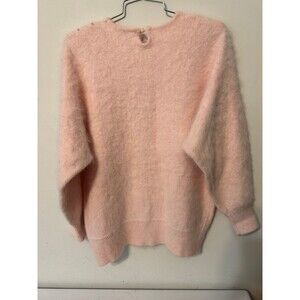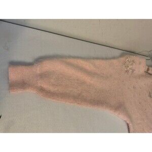 This very beautiful feminine pullover is an angora blend and adorned with patterns of very light pink seed pearls. Crewneck with button opening in back. Raglan sleeves. Small shoulder pads. I believe it is a size medium-there is no size label so please look at measurements.