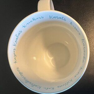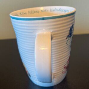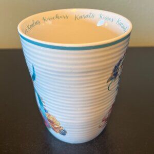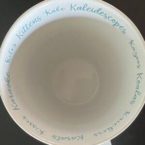 Sip your favorite drinks in personalized style in this lovely Lisa Audit ceramic mug with an elegant floral arrangement surrounding a large letter K to represent your first or last name. Both sides feature a large, two-tone blue capital letter K adorned with pink, blue, white, and yellow flowers against a white, ribbed textured surface. Chic and comfortable easy-to-grip handle. A soft blue border circles the exterior below the rim. Like an acrostic or alliteration poem, blue, cursive words beginning with the letter K circle the interior below the rim: Kisses, Karaoke, Kites, Kittens, Kale, Kaleidoscopes, Kazoos, Koalas, Knickers, and Karats. Dishwasher and microwave safe. Measures 4.75” tall with a 4” ; 5.5” across including handle. Holds 16 fluid oz. From Lisa Audit.