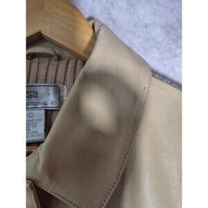 The LISA INTERNATIONAL Lamb Skin Leather Sweater Vest in beige is a stylish and versatile piece perfect for a variety of occasions including travel, casual wear, work, and business. This Y2K vintage vest features a button-up design with lamb skin leather front and soft knit back and a soft shell fabric, and breathable features making it ideal for the winter, fall, and spring seasons. The lightweight and packable design allows for easy transport, while the mid-length and sleeveless style offer a comfortable fit. The vest is accented with a collared neckline and is a fashionable choice for those looking for a blend of both style and functionality in their outerwear. PTP 20 in. Length 24.5 in.