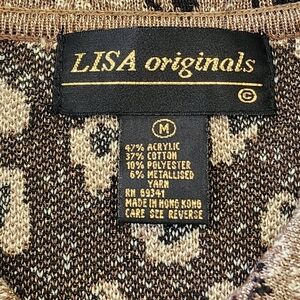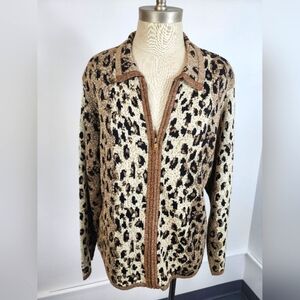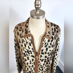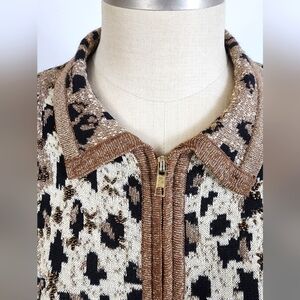 Lisa Original stylish leopard print cardigan with a zip front, 90s shoulder pads. Features a mix of tan, black, cream, and metallic colors eith all over beading.