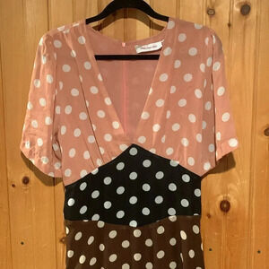 Lisa Says Gah color block Amelia polka dot midi dress. No callouts to note. Stock photo added for reference from the website.