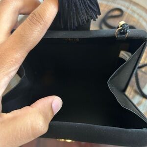 Chic black mini bag with a stylish tassel. Ideal for versatile fashion. Vintage black evening clutch / crossbody with tassel in the front by Lisette. Braided strap that can be tucked into the bag. In good condition. Snap button closure.