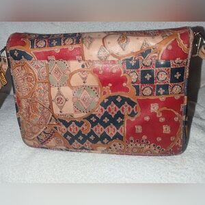 Vintage shoulder bag with a unique multi print leather pattern. Features red, brown, and tan colors. Ideal for versatile use. Flap magnetic closure. Three compartments under flap. Middle compartment with zipper closure. One zip pocket inside. Adjustable shoulder strap 16.5" drop. Bag is in very good pre-owned vintage condition. 11.5"-8"-3"