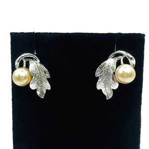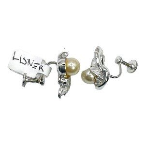 LISNER Vintage 60s Silver Leaf Faux Pearl Screw Back Earrings, Signed