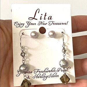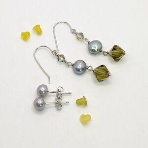 One pair is Pearl stud style earrings. The posts and closures are marked 925. The second pair of earrings is dangle style with pearls and Swarovski Crystals. The ear wires are marked 925.