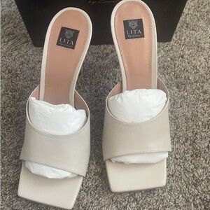 Grammy Award winning singer, dancer, model and designer Ciara Owned/Founded -- Lita by Ciara Color: CREAM - Made in Italy - 100% Calfskin Leather Upper Brand New in Box - Handcrafted in Italy Fully lined in leather 100mm heel Leather sole A sleek square toe and towering stiletto heel frame a striking leather sandal that will highlight your trendsetting style. 4" heel Leather upper and sole lining.