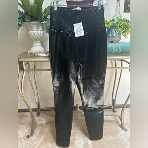 Sleek shiny black faux leather leggings by LITA. Very stretchy high waist smocked elastic waist, viscose / Poly blend. Length Measurement 40” . Brand new with tags !