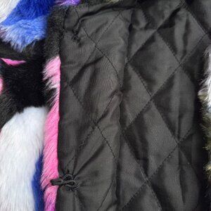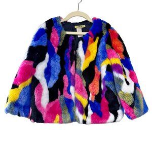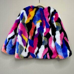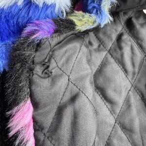 Brighten up the playground with this eye-catching multicolor faux fur jacket. It's like a rainbow explosion met a fluffy cloud and decided to party.
