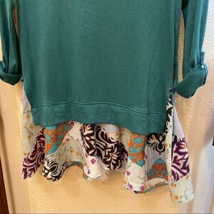 Pre-owned in great condition with no rips or stains. Tunic top from Anthropologie size Xsmall. It’s a 3/4 sleeve roll up with button closure and high low hem. Beautiful print ruffled hem. Comes from smoke and pet free home.