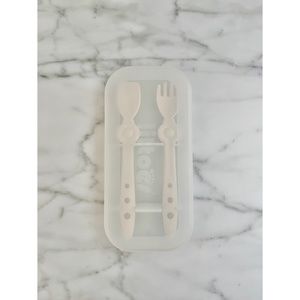 Balancing stand keeps heads of fork and spoon off table, maintaining sanitary eating surface.