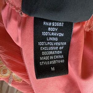 Very cute embroidered BoHo style dress. The color is more of a coral than a pink. The dress has an elastic neckline, so it could be worn on the shoulder or off the shoulder. The dress is lined.