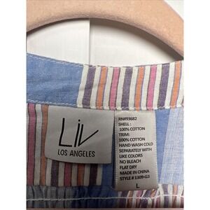 The LIV Los Angeles Striped Boho Beach Tassel Cotton Tunic Cover Up in size Large is a stylish and versatile piece perfect for traveling or casual occasions. Made from 100% cotton, this tunic features a V-neckline, 3/4 puff sleeves, and colorful striped pattern with tasseled accents. The breathable and packable material make it ideal for wearing in the summer, fall, or spring seasons. With its bohemian and beachy theme, this tunic exudes a carefree and trendy vibe, ideal for those looking to add a touch of California style to their wardrobe.