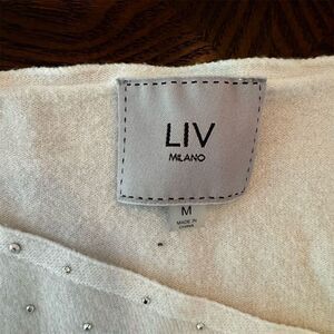Wrap yourself in the cozy elegance of the LIV Milano pullover sweater, a perfect addition to your fall wardrobe. This women's medium-sized sweater in a classic white hue features a flattering V-neckline and is adorned with sparkling rhinestone embellishments, adding a touch of glamour to your casual outings. Crafted from a soft blend of rayon, polyester, and nylon, it offers a comfortable fit for any casual occasion, from brunch with friends to a relaxed evening stroll. Hand wash only to maintain its charm. Pre-owned but in excellent condition. Smoke Free Home.