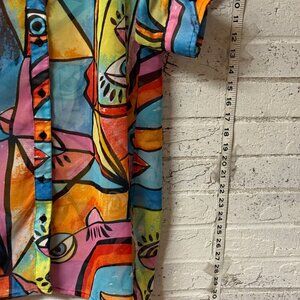 Bring bold vibes and art-gallery glam with this stunning tunic top by LIVE 4 TRUTH, size Small. Features an allover surrealist face print in vibrant rainbow colors—think Picasso meets pop art! Lightweight and breathable 100% polyester, this button-down shirt works as a long blouse, beach cover-up, or statement layering piece. Features roll-tab sleeves and a curved hem for extra flair.